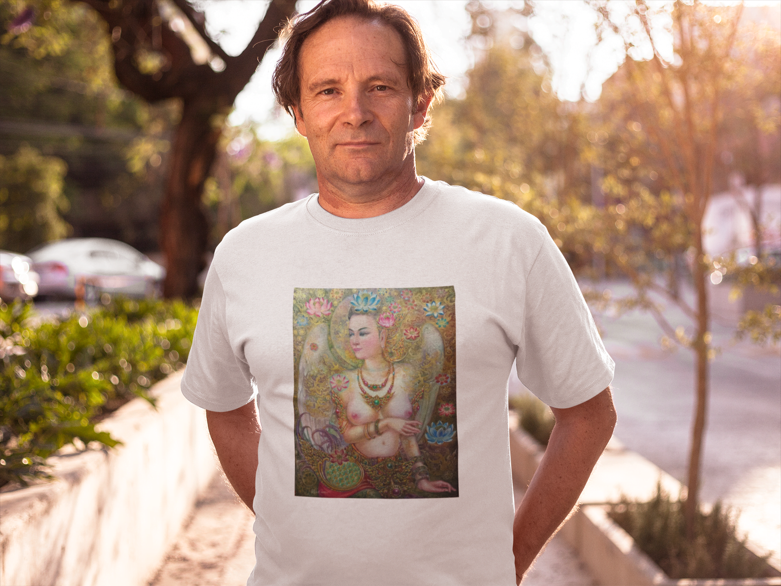 Celebrate the exquisite beauty and rich cultural heritage of Thailand with our Men’s Thai Art-Inspired Kinnaree T-Shirt. This t-shirt features the sixth painting in a series of seven, depicting the enchanting Kinnaree from the classic Thai literature “Phra Suthon Manora.” The artist aims to complete a series of seven Kinnaree paintings, each one capturing the elegance and grace of these mythical beings.