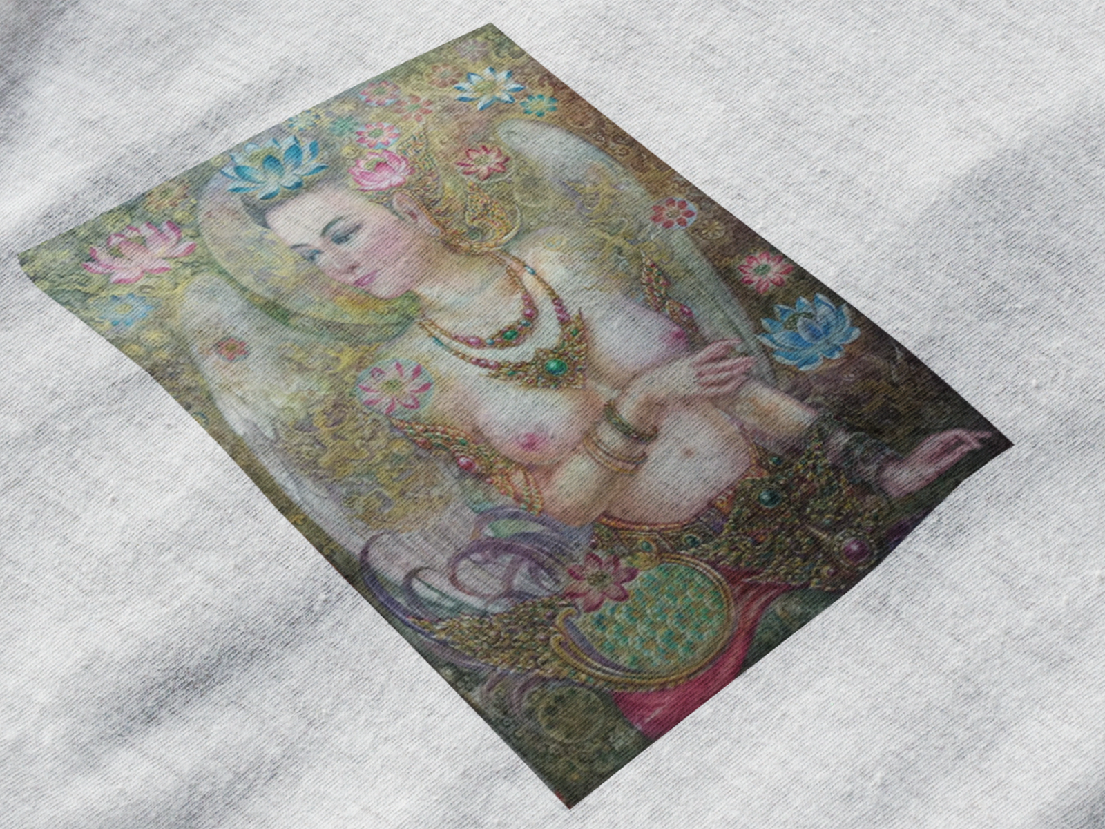 The detailed artwork highlights the stunning beauty of the Kinnaree, showcasing the delicate features, graceful posture, and traditional Thai attire. The intricate design of the clothing and accessories reflects the timeless elegance and sophistication of Thai art. This t-shirt is not just a piece of clothing but a wearable canvas that celebrates the splendor of Thai culture and the allure of feminine beauty.