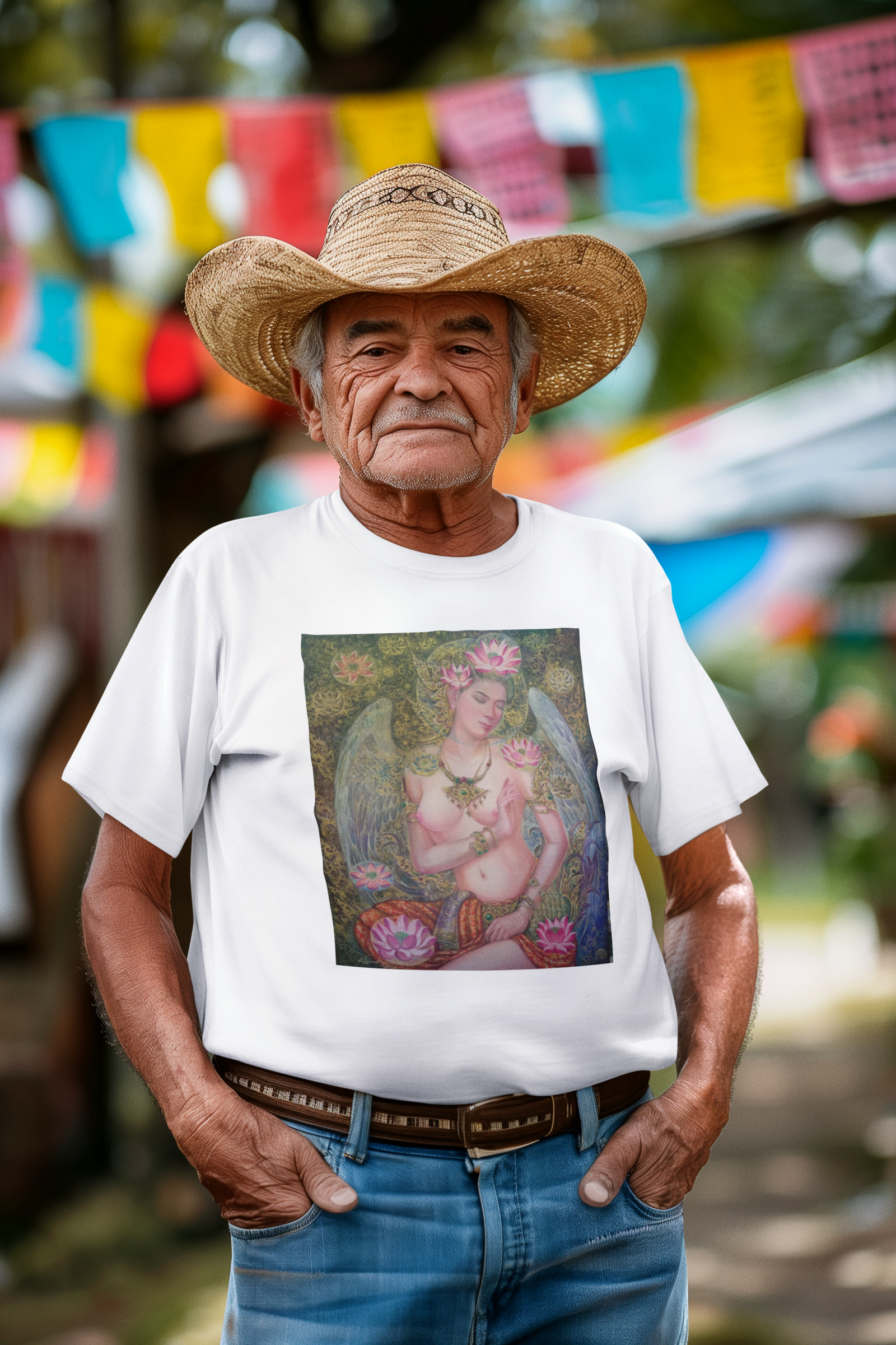 Embrace Thai folklore with the Kinaree Enchantment T-Shirt. Featuring a detailed print of the seven Kinaree maidens inspired by the tale of Manora and Prince Suthon, this 100% cotton tee blends traditional Thai art with contemporary design. Perfect for showcasing your love for cultural artistry.