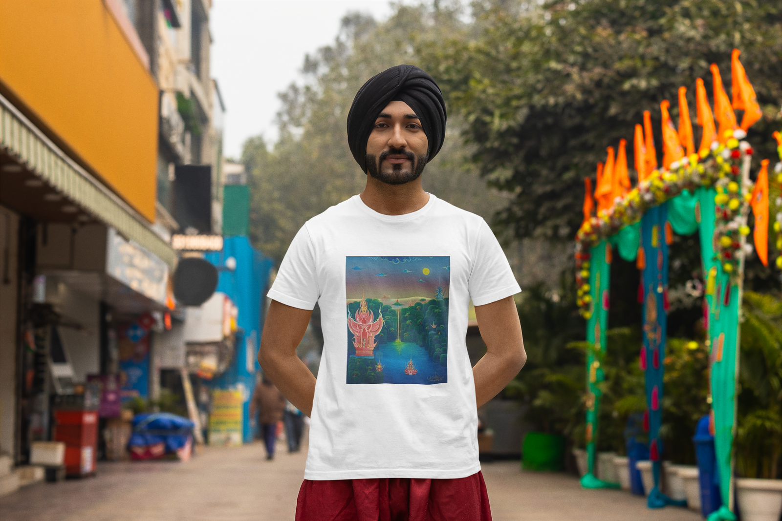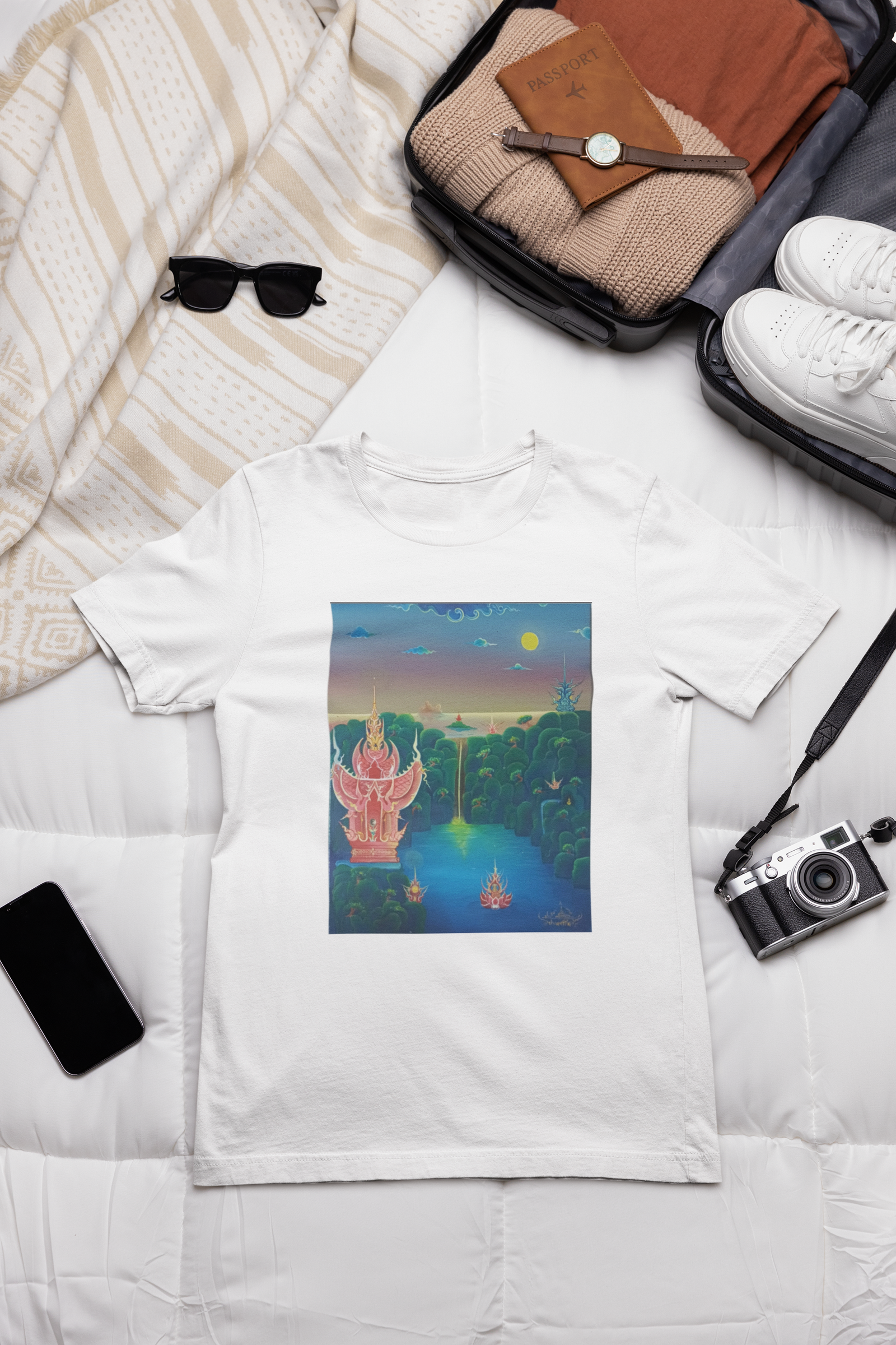 The center of the design showcases a majestic structure surrounded by lush greenery and a tranquil water body, evoking a sense of peace and wonder. The dreamlike quality of the painting invites you to envision a perfect getaway, far from the hustle and bustle of everyday life. This t-shirt is more than just a piece of clothing; it’s an invitation to dream and an expression of your aspirations.
