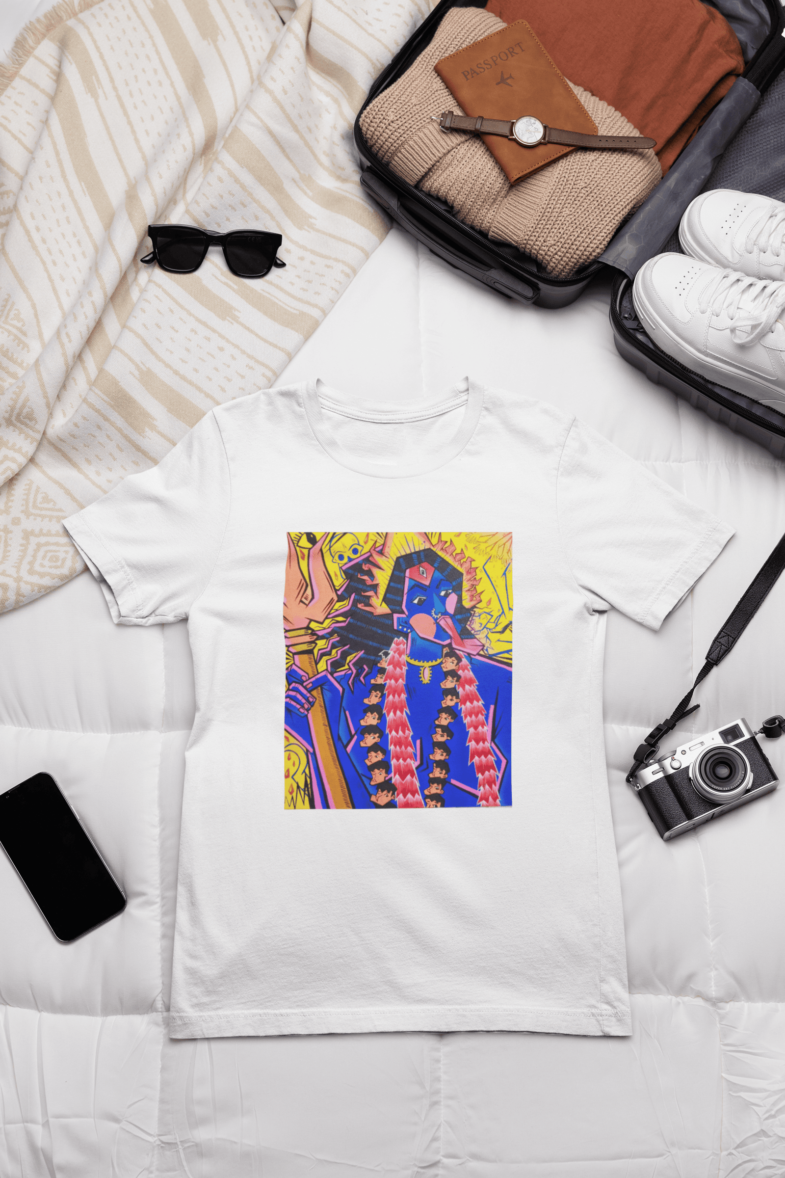 “Embrace divine power with our ‘My Kali’ T-shirt. This striking white tee features a vibrant, contemporary interpretation of the Hindu goddess Kali. The eye-catching design showcases a bold, abstract representation of the deity in electric blue, adorned with her iconic necklace of skulls reimagined in vivid red. Set against a dynamic yellow background, this artistic rendition captures Kali’s fierce energy and transformative nature.