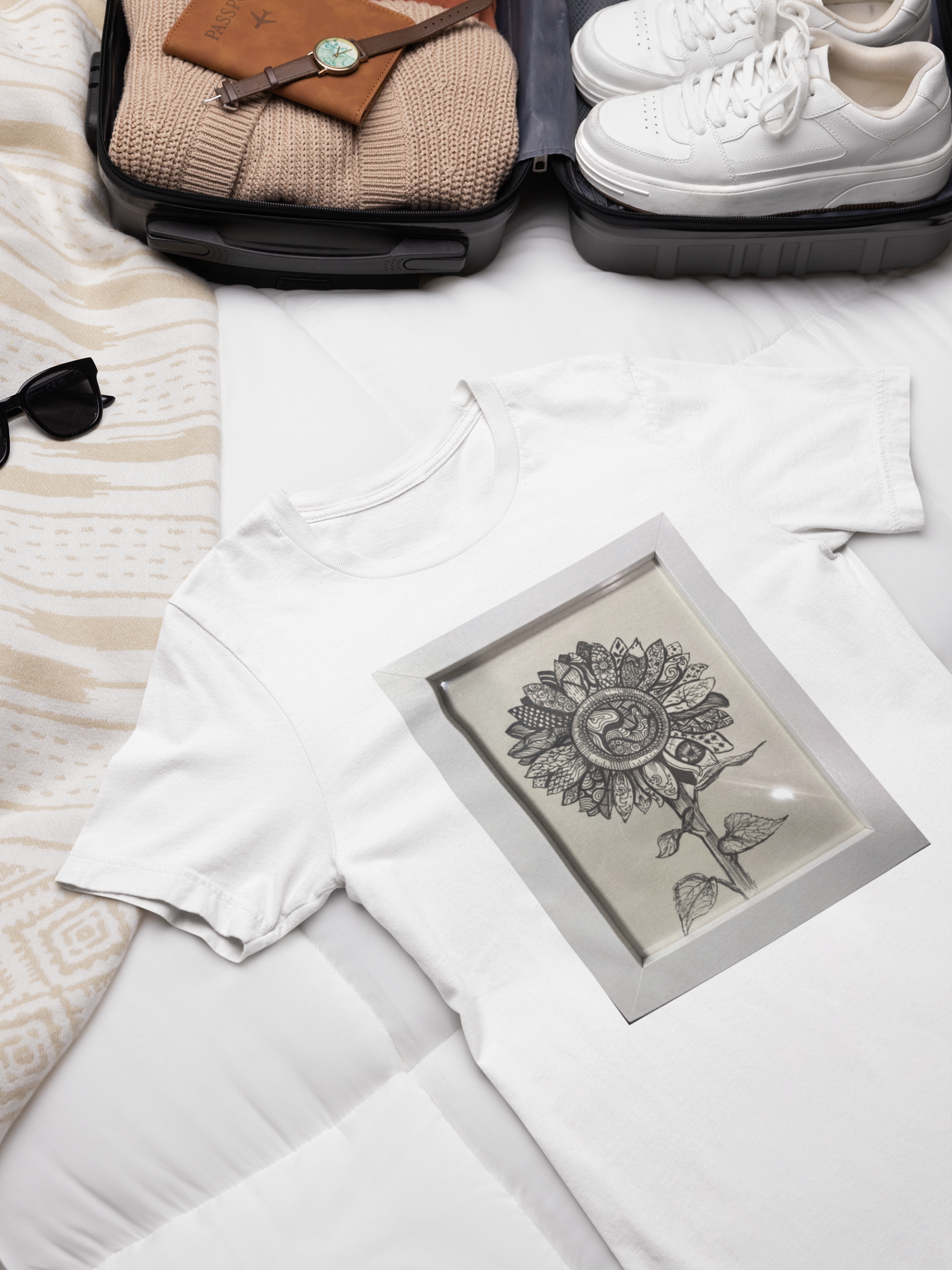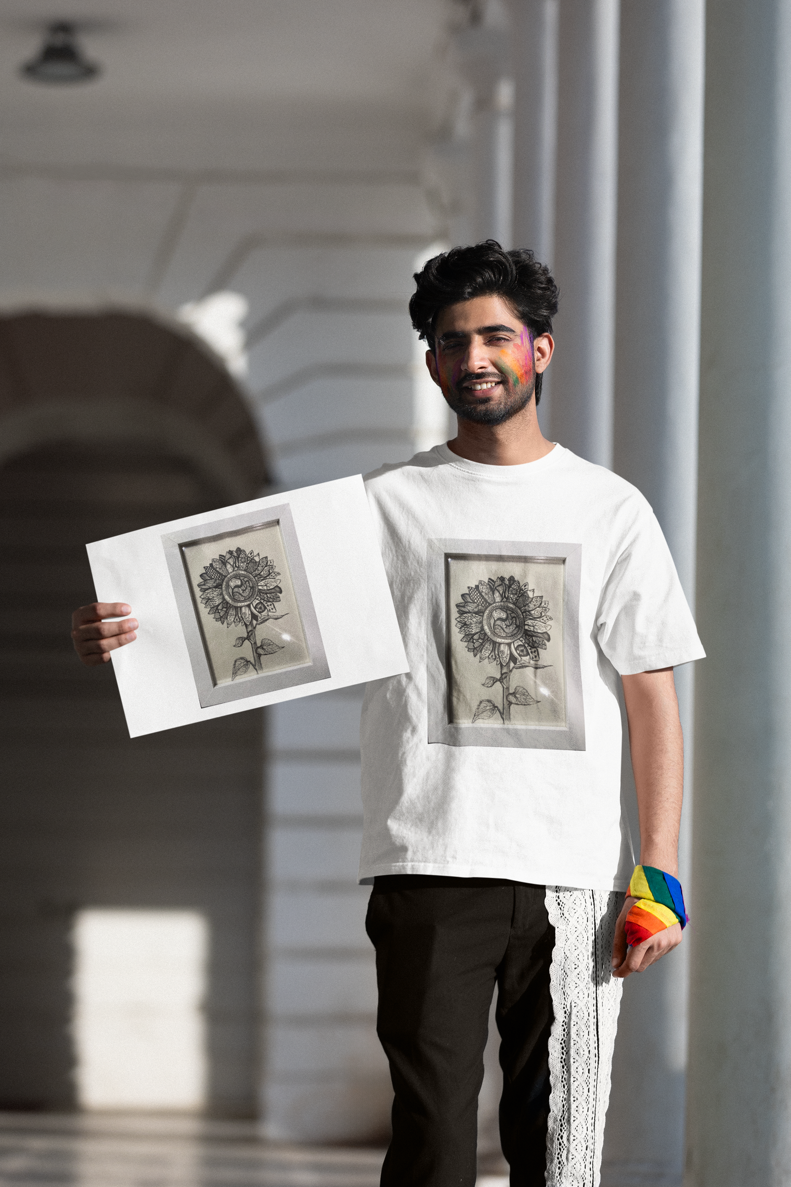 Celebrate unique love with our artful sunflower design. Inspired by a flower that chose its own sun, this illustration symbolizes devotion that defies convention. Available as a comfortable white tee and matching print, it’s the perfect way to express a love that stands apart. Ideal for those who cherish extraordinary connections.”
