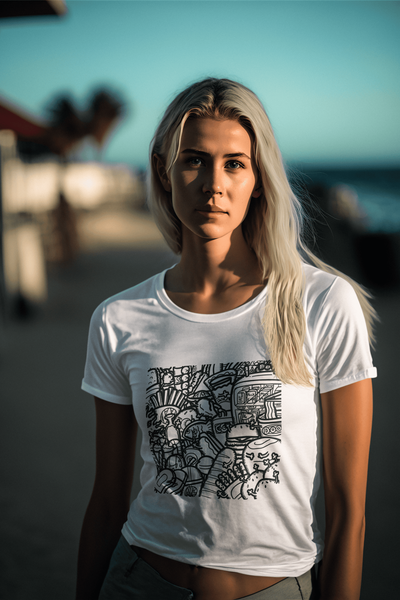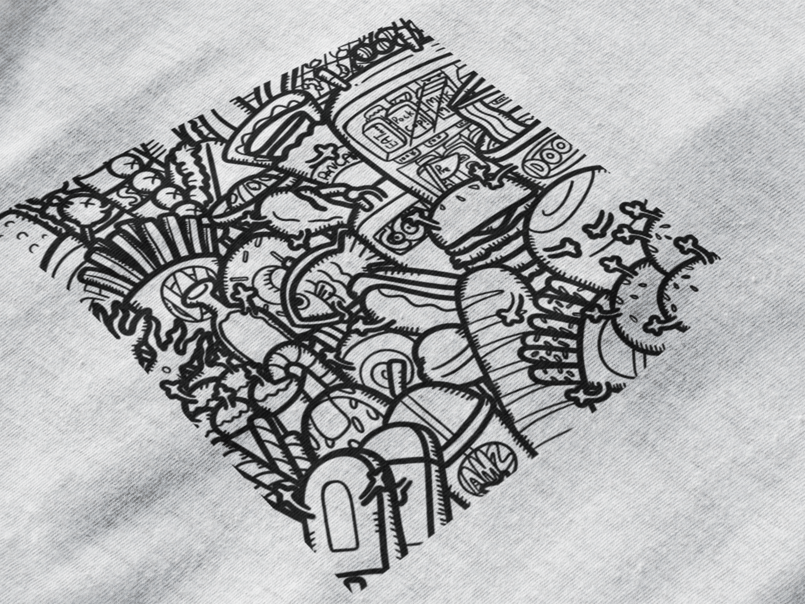 เคThis white t-shirt features a unique and intricate black line art graphic, inspired by a heartfelt moment of realization. The design is a detailed and lively illustration of various people enjoying delicious food, capturing the essence of happiness in everyday life. The artist created this piece while waiting for a loved one, observing the joy and smiles of people dining at a restaurant. This simple yet profound moment reminded them that “delicious food” is a straightforward and accessible source of happiness.